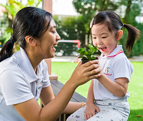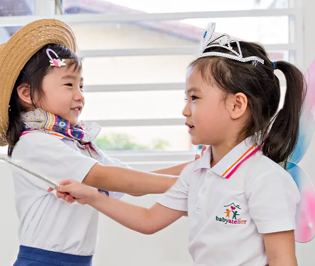 Baby Atelier offers programs for different age groups, including Infant Care (4 weeks to 15 months), Toddlers (15 months to 2 years), Playschool (2 to 3 years old), Pre-school (3 to 4 years old), and Kindergarten (4 to 6 years old).